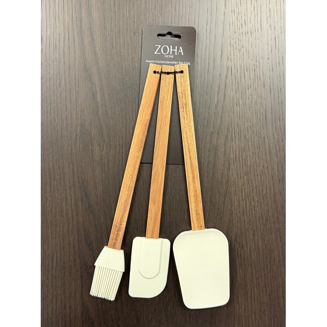 Bu 3 parçalı mutfak gereçleri seti, akasya ağacının sıcak görünümünü silikonun kullanım kolaylığıyla birleştiriyor. Set, spatula , delikli kaşık ve pasta fırçasından oluşuyor; yemek pişirmek ve fırınlamak için ideal.